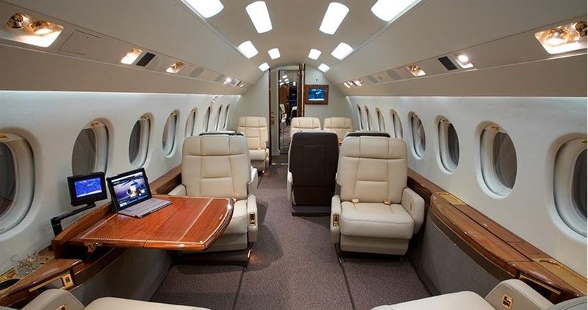 The Falcon 2000 is a heavy jet with a heavy set of features. It includes an enclosed lavatory, CD player, DVD player, power outlets, AirShow, a slot oven, a television, a VCR, and ground-based Wi-Fi.